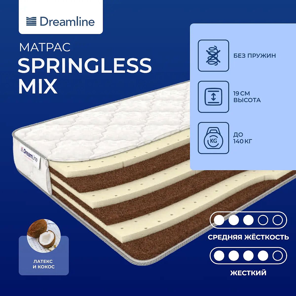 Натуральное наполнениеБлагодаря тому, что наполнение матраса составляют только натуральные наполнители, цена его возрастает. Но вы получаете настоящее качество и комфорт!Матрас на основе упругого латексаНатуральный латекс - материал повышенной упругости и мягкости. Он максимально комфортный и отлично вентилируется за счет того, что структура его пористая.Долговечный кокосКокосовая койра благодаря повышенной жесткости отлично поддерживает слои латекса и всю конструкцию в целом. Это материал очень износостойкий и долговечный.Чехол из хлопкового жаккардаЧехол сшит из гипоаллергенного хлопкового жаккарда со стежкой на холлконе.Защита матрасаДля дополнительной защиты закажите защитный или водонепроницаемый наматрасник, он увеличит срок службы матраса, а также создаст на спальной поверхности уют и комфорт.Двусторонняя модельМодель имеет двустороннее наполнение, поэтому ее можно переворачивать, - таким образом, вы получаете два матраса в одном.Другие моделиЕсли вы предпочитаете матрасы помягче, то посмотрите модель Dreamline Mix Soft.
