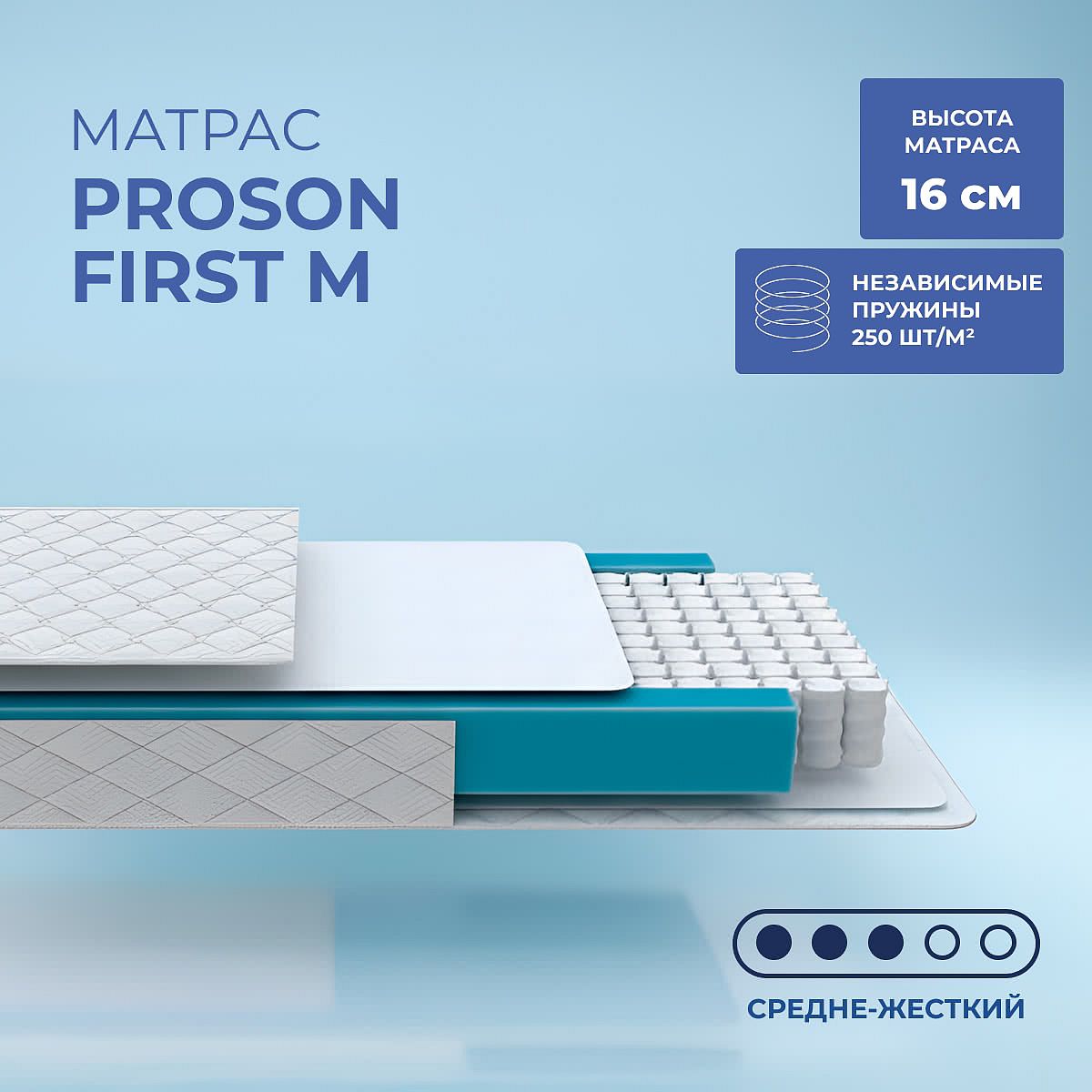 Матрас ProSon First M — это практичный выбор для комфортного ежедневного сна. Средняя жесткость обеих сторон обеспечивает универсальную поддержку, подходящую для большинства пользователей. Независимый пружинный блок EVS500 PRO с плотностью 250 пружин на м2 способствует равномерному распределению веса и снижает передачу движений, что особенно важно для пар. Высота матраса 16 см позволяет использовать его как на стандартных кроватях, так и в компактных интерьерах. Чехол выполнен из жаккарда и простёган на слое пены Ortofoam толщиной 10 мм, что добавляет мягкости поверхности и делает матрас приятным на ощупь. Отсутствие кокосовой койры и одинаковая жесткость сторон делают ProSon First M универсальным для ежедневного использования. Ключевые особенности