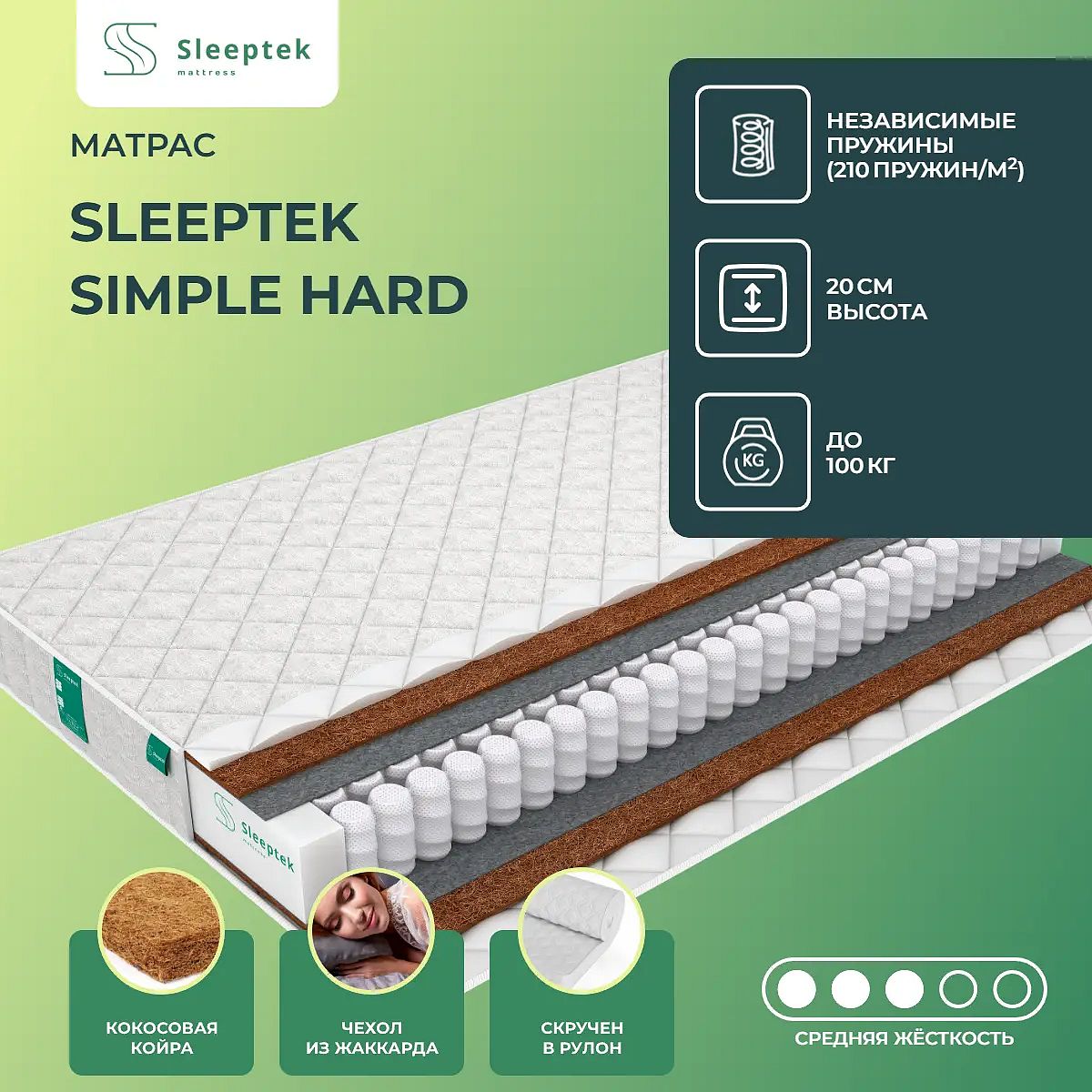 Матрас «Sleeptek Simple Hard» — средней жесткости, которая подходит большинству людей среднего телосложения. Это — универсальный выбор и детям, и взрослым, и пожилым людям.